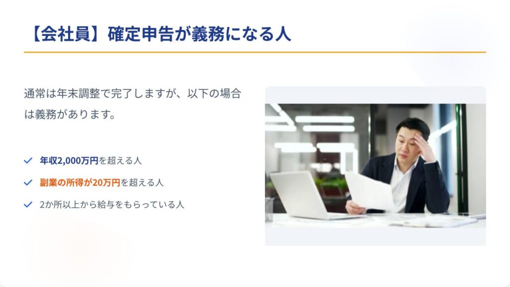 会社員は通常、年末調整で税金の計算が完了しますが、以下の場合は自分で確定申告をする義務があります。