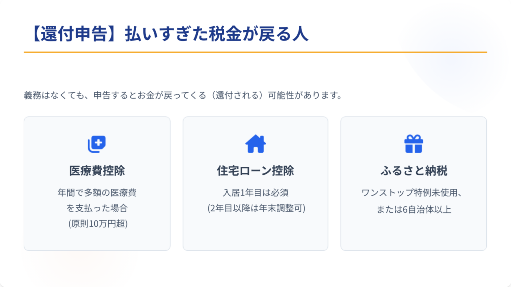- 還付申告: 医療費控除や1年目の住宅ローン控除は確定申告が必須。その際、ふるさと納税の再入力(ワンストップ無効化)に注意。
