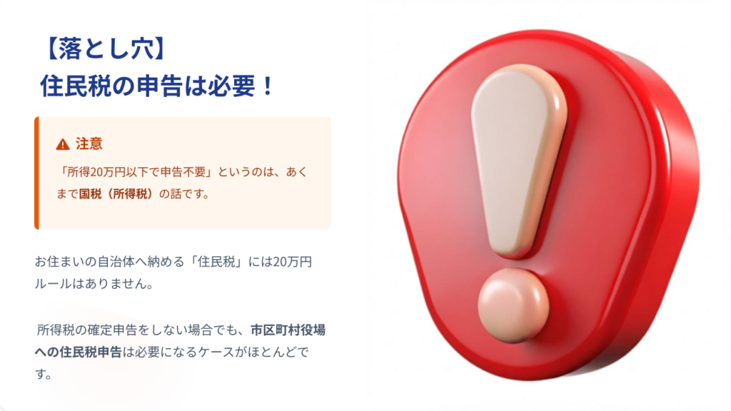 - 会社員: 副業所得20万円超は義務。20万円以下でも「住民税の申告」は忘れずに。