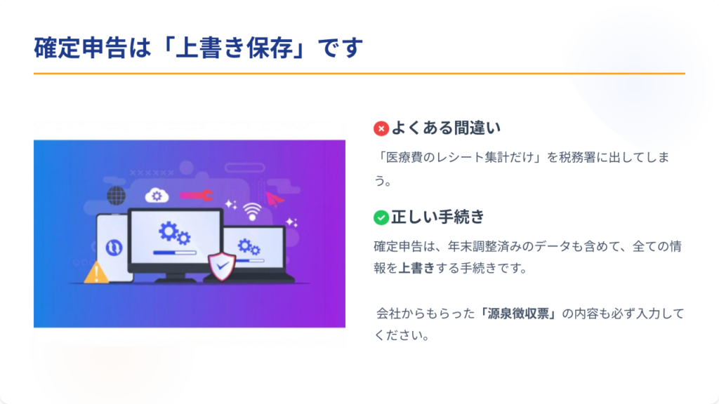よくある間違いが、「医療費のレシート集計だけを税務署に出す」というものです。 確定申告は、年末調整済みのデータも含めて、すべての情報を「上書き」する手続きです。